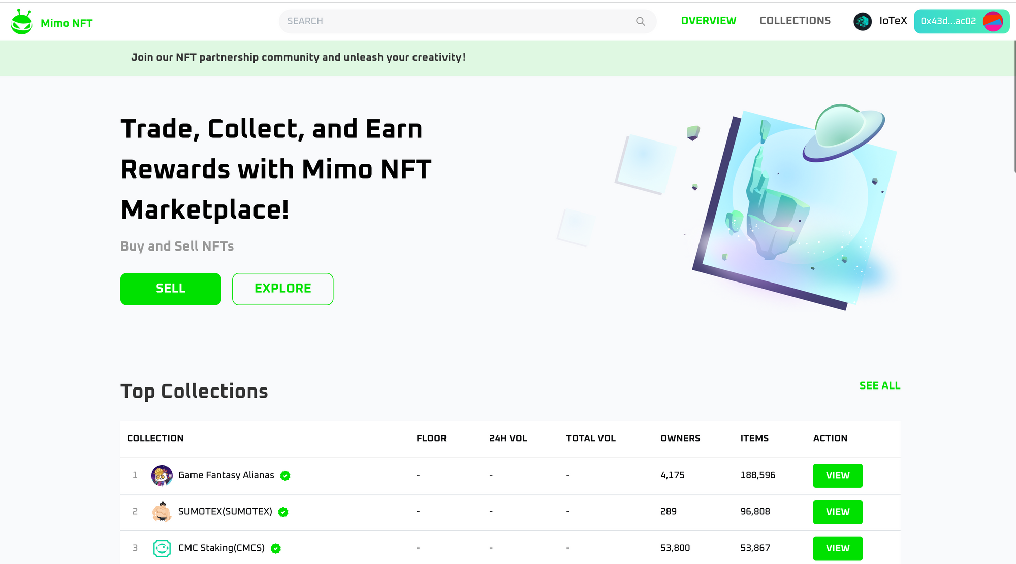 The mimo NFT marketplace provides a seamless and secure platform for buying and selling NFTs. With the rise of NFTs as a new asset class it became evident that there was a need for a dedicated NFT marketplace on IoTeX to support the growing demand for NFTs across various industries including DePIN, art, gaming, and music. Mimo boasts low transaction fees, short transaction times, and a user-friendly interface.